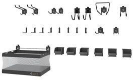 2 Tool Hooks, 6 Small Items Bins, 1 24" Mesh Basket, 2 Big Hooks, 2 Twin Hook, 4 J Hooks, 4 L Hooks, 1 Scoop Hook, 1 Deep Hook, 1 Wide Hook, 1 Utility Hook