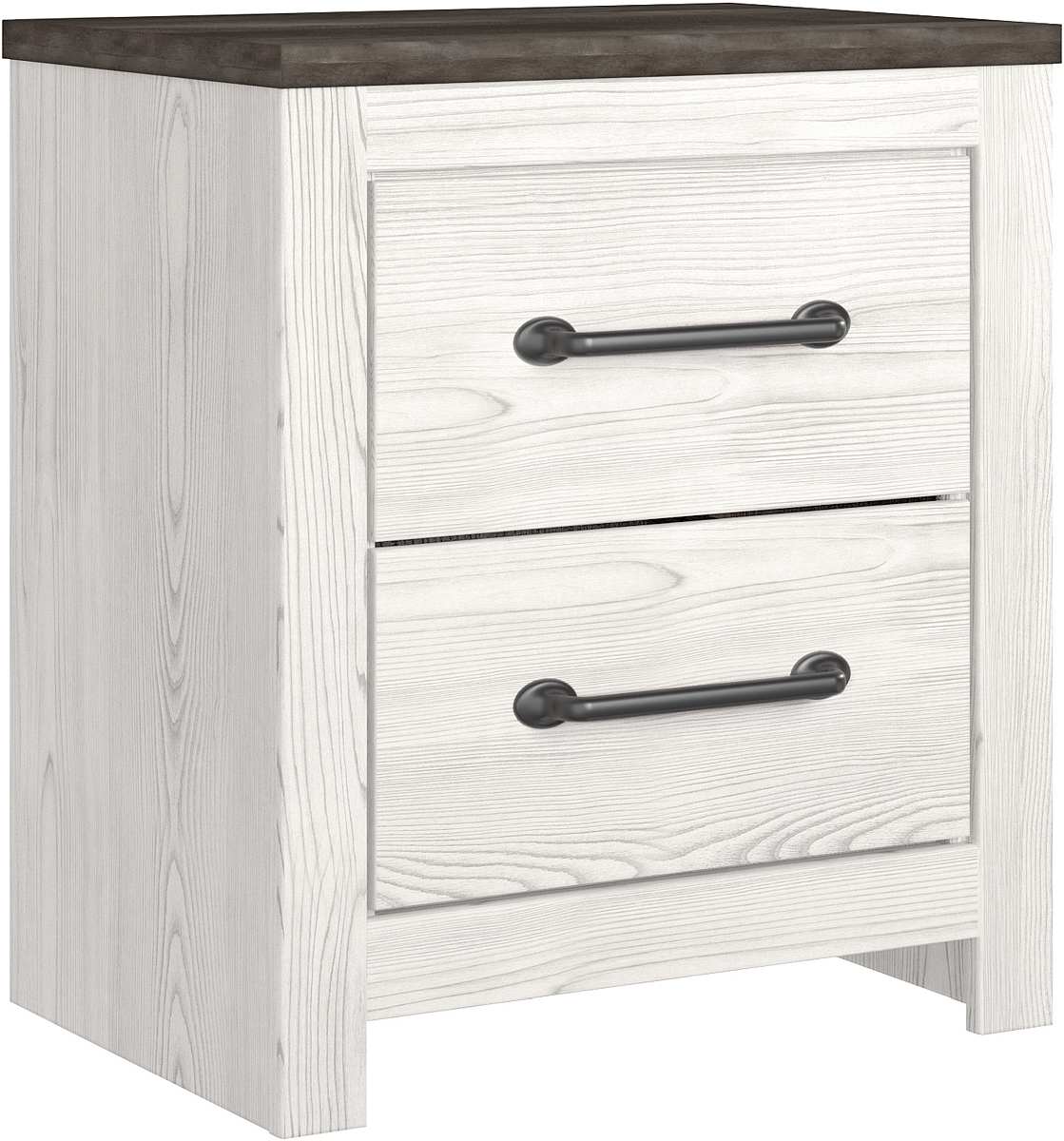 Cool, clean and casually modern. This nightstand's wispy whitewash and gray finish sets the tone for your calming sanctuary. Large linear pulls add dimension and authenticity. Two smooth-gliding drawers neatly accommodate your bedside needs.